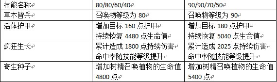 树精召唤植物的生命力获得增强,90级终极状态时,树精召唤的植物已经能额外获得5400点生命值了,这就意味着召唤的植物不是脆弱得不堪一击,而是能更持久的抗住伤害,增加输出。