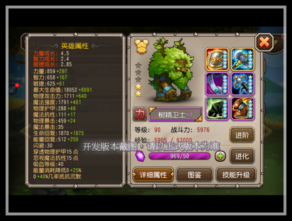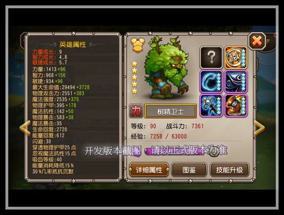 从属性上我们可以看到,树精卫士作为前排战士,可以变身为树形态,召唤植物打击敌人。在力量成长和生命值等前排英雄必备素质上都非常可观。