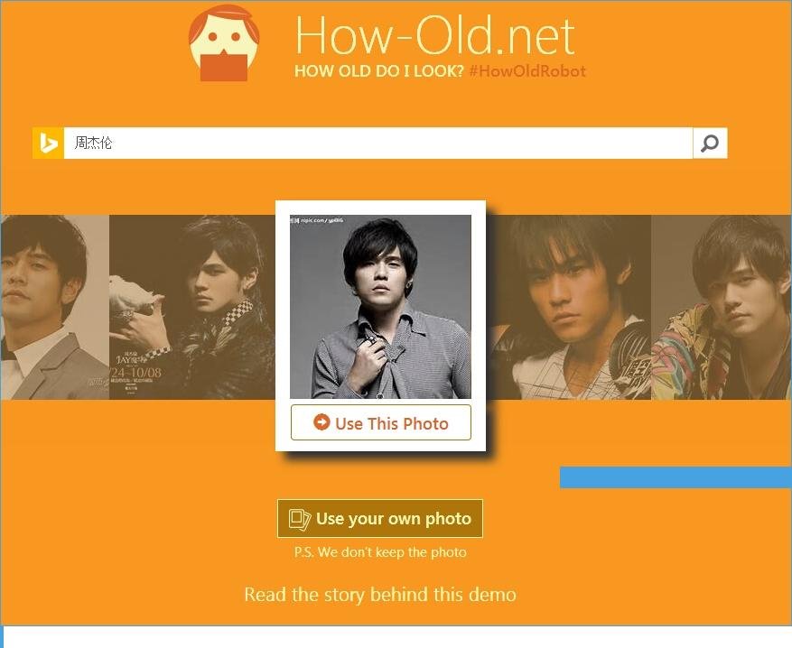 2、在网页的搜索框中输入关键词,如搜索:周杰伦 那么周杰伦的照片就会进入下面的列表,点击 Use This Photo 即可查看机器人识别到的年龄。