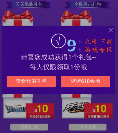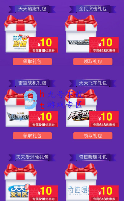 注意,本次六个游戏礼包只能领取一个,打个比方,领了天天酷跑礼包,就不能领取全民突击礼包了。