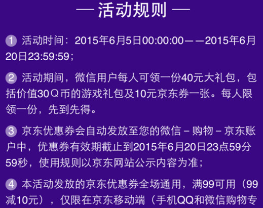 2、活动期间,每人可领1份40元大礼包,包括价值30Q币的游戏礼包及10元京东券一张。每人限领1份,先到先得。