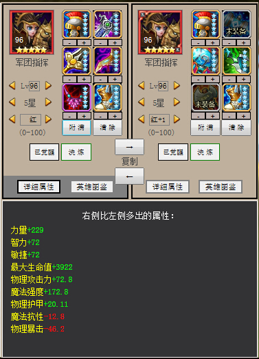 以上,就是目前的英雄军团在进阶到红1以后和红0的对比,大家可以看到上面的属性都有比较大的提升,当然魔法抗性还有物理暴击等方面都略有减少,大家见仁见智!