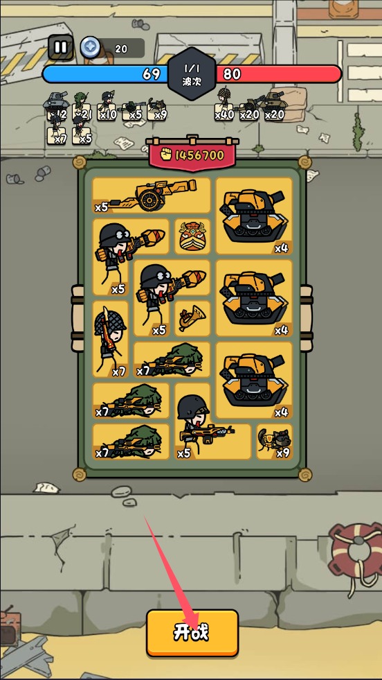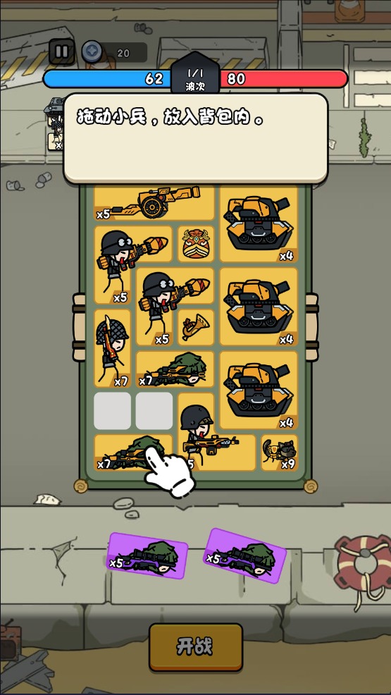 1、拖动小兵放入背包内,相同的兵可以合成更高等级的兵。