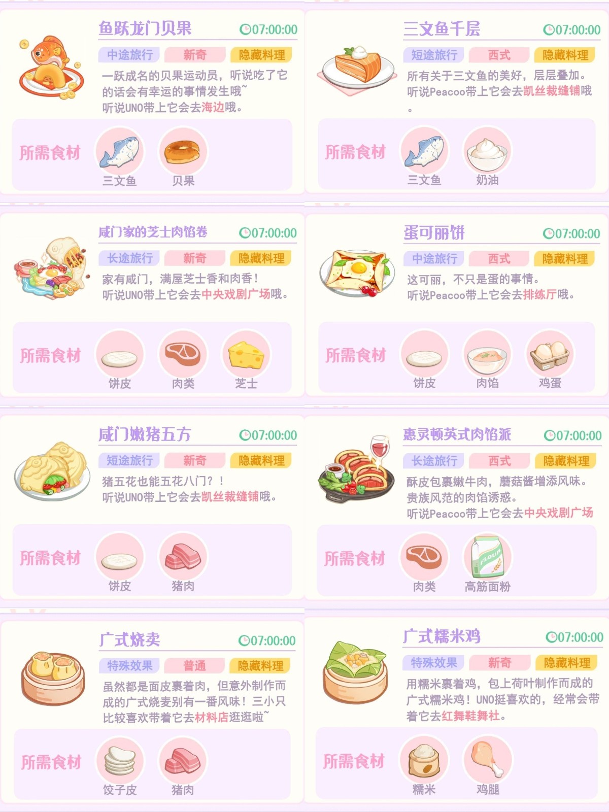 游戏中提供了多种不同的菜谱,包括半成品和完整料理。半成品是指不能直接携带,需要二次加工的食物;而完整料理则可以给角色带上。需要注意的是,烹饪一次可能需要数小时,并且某些食材会用到半成品。