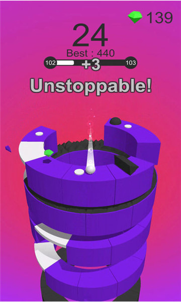 游戏中你需要通过滑动手指来旋转圆柱体,使球不断跳跃,来击碎所有的方块,通往下一层,但是注意不要碰到任何的障碍物。