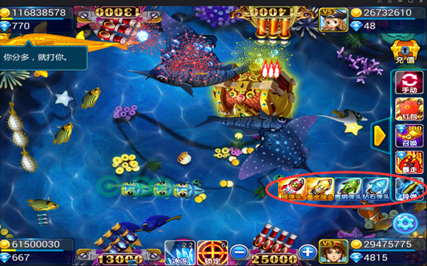2.多样的武器:游戏中提供多种不同的武器供玩家选择,包括普通枪、炸弹等,玩家可以根据鱼的种类和大小选择适合的武器。