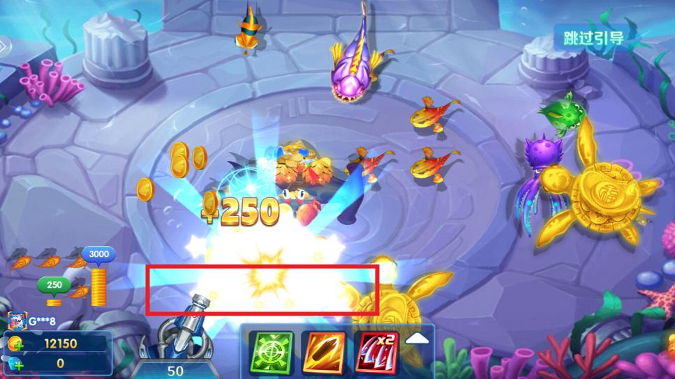 朝着鱼群,点击屏幕,发射炮弹,捕鱼获得金币