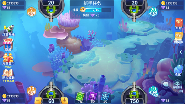 新手任务是建议每一位捕鱼萌新都要做的。因为新手任务不仅有强化石奖励,还有法宝奖励,奖励可谓是非常丰富多样的。完成特定任务还能获取抽奖机会,可以随机抽取金币、捕鱼道具、强化石等奖励,同时还能随机获得积分参与排行榜(也是奖励强化石的噢)。