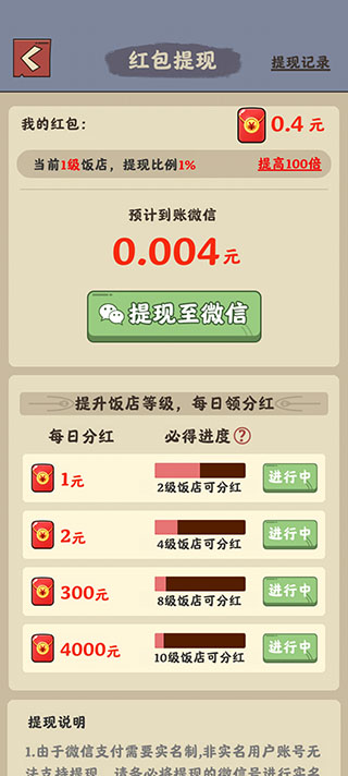 玩家点击右上角饭店,可以查看好评量,好评越多饭店等级越高,饭店升级也可以获得红包。