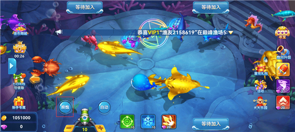 5、升级炮台:通过积累金币升级炮台等级,提升发射威力,更轻松捕捉高分鱼类。