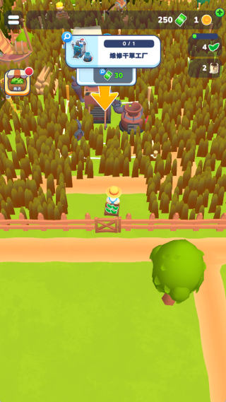 1、进入游戏,可以观察上方的任务,去完成任务,维修干草工厂,赚取钱币;