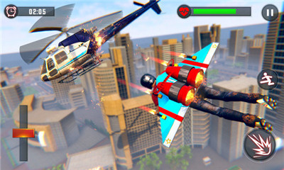 喷气背包飞行英雄是一款具有超爽快战斗体验的动作冒险游戏,玩家在游戏内通过使用喷气背包可以在天空之中自有的飞翔,你将与城市内的所有犯罪分子进行战斗,包括了地面的汽车追逐战以及天空中与直升飞机的空战,你的喷气背包不仅能够帮助你飞翔还装有多种武器,灵活的使用它你是