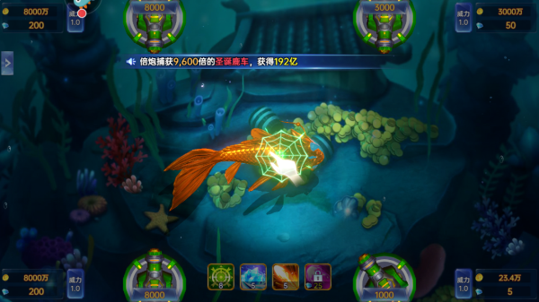 5、同时本作为了方便玩家在一些特殊情况下捕捉心仪的鱼类,特意加入了全新的道具和技能系统,锁定、冰冻、狂暴等等多种多样的技能,让你无论是用来提升火力还是用来辅助瞄准都能手到擒来,真的是殴打BOSS,搜寻宝藏的必备之选。