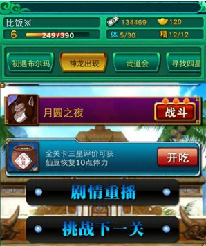 4.当完成一个关卡内的所有副本后可以继续进行下一个关卡,另外如果能在所有的副本关卡中都拿到3星评价,可以获得仙豆道具来补充10点体力。