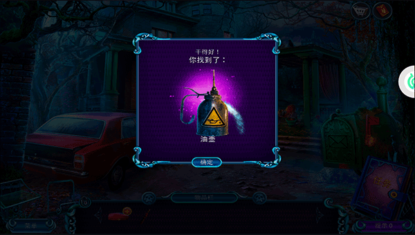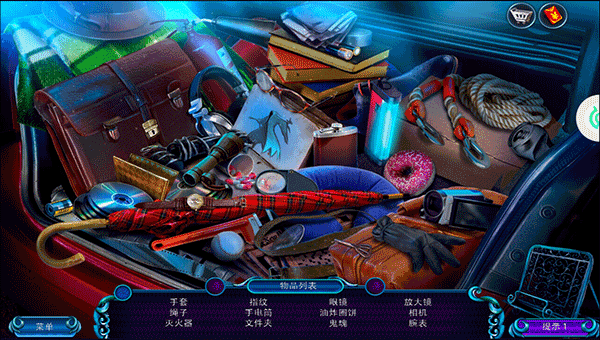7、后备箱有很多东西,玩家需要在这里找到手套、灭火器、指纹、手电筒、文件夹、眼镜油炸圈饼、放大镜、相机、腕表、绳子、鬼魂物品,最高效的方法是随便乱点,因为没有错误惩罚,所以这种方法反而是最快的;
