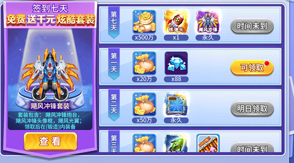 3、七日签到奖励,签到七天,免费领取炫酷炮塔套装、高级道具等。