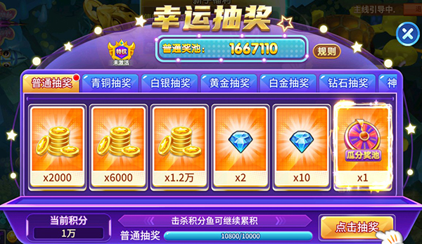 2、玩家在捕鱼过程中还能参与幸运抽奖,普通、青铜、白银等多种奖池等你来抽。