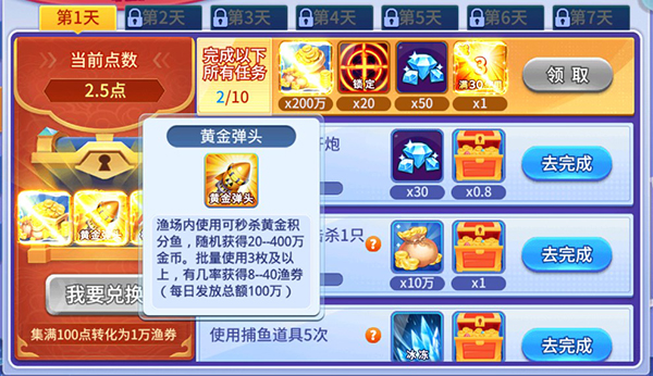 1、玩家开局就能获得启航助力礼包,内含大量金币钻石和道具,助力玩家称霸渔场。