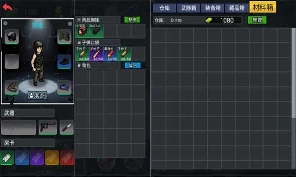 背包管理:点击背包图标,拖拽物品整理,长按可丢弃或使用(如药品、弹药)