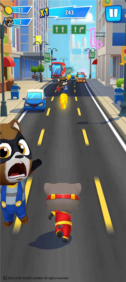 talking tom hero dash游戏采用卡通的画风,以跑酷类的玩法为主;