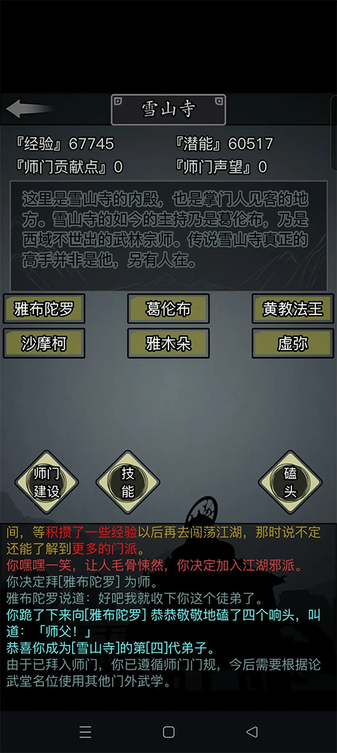 3.拜师后我们点击师门就可以进入师门主页面,一般来讲只有五个人,前三个是你可以拜师的师傅,第四个是讲门派故事的老登,第五个是卖门派残页的小登。有的门派特殊,有多个师傅如上图