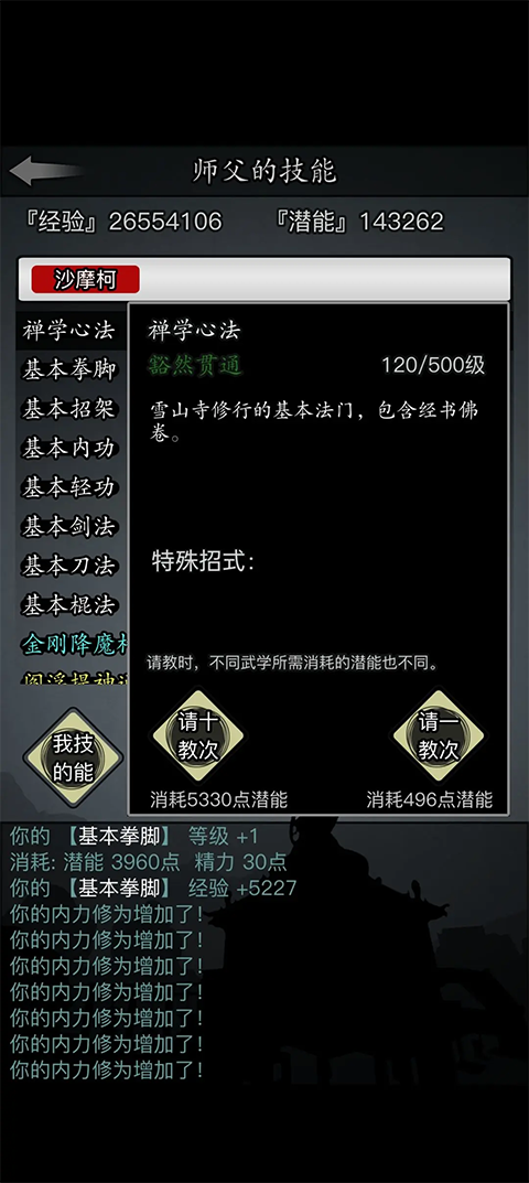 4.点击师傅后可以请安获得500贡献点,有月卡可以额外获得2000贡献点,点请教可以学习技能。