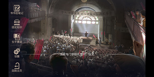 2、点击左上角的菜单,会出现爷爷的笔记、团史知识、生平事迹、设置、回到主页,五个选项。