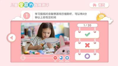 通过每月在线评量协助父母了解孩子每个成长阶段的状况,获取专业报告,解析孩子发展的优弱势能力,指导父母更好地养育孩子。提供多样训练活动,将发展任务进一步转化成日常游戏。《儿童全能力测评》的测评内容来自台湾专业儿童感统测评体系,获得上海华东师大独家认证;已有百万父母完成测评。