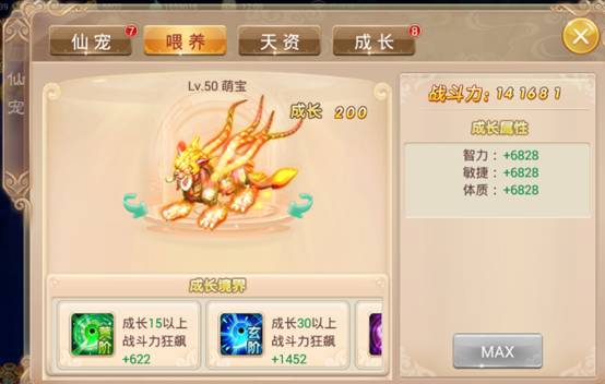 2.宠物成长:角色15级开启宠物成长,提升成长可以获得大量属性加成,每天都可以免费提升1次成长;成长达到一定条件还可以激活成长境界:元阶、玄阶、人阶、地阶、天阶,每达到一定阶段,都可以获得额外加成