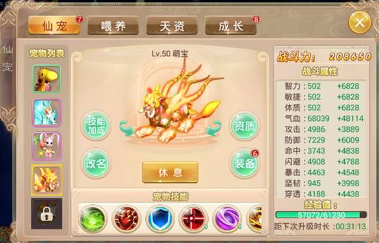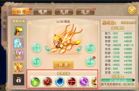 4.技能:游戏内可获得宠物技能书,技能修炼达到一定等级后还有额外的属性加成