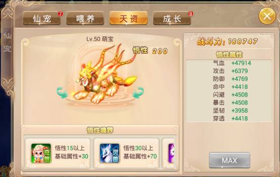3.悟性:角色45级开启宠物悟性,提升悟性可以获得大量属性加成,每天都可以免费提升1次悟性;悟性达到一定条件还可以激活悟性境界:奇兽、灵兽、仙兽、神兽、圣兽,每达到一定阶段,都可以获得额外加成
