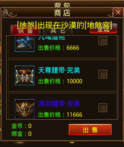 其实这个办法非常简单,就是出售非绑定装备,也就是BOSS掉落的装备,游戏中每种装备的出售价格如下图: