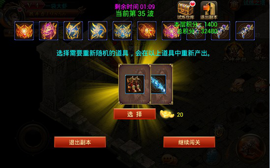 下面一行的才是你得到的装备,可以花20元宝废除一件装备,然后从上面一行中随机选取一件装备进行补充。注意哦,第二次随机需要40元宝,第三次80,以此类推。