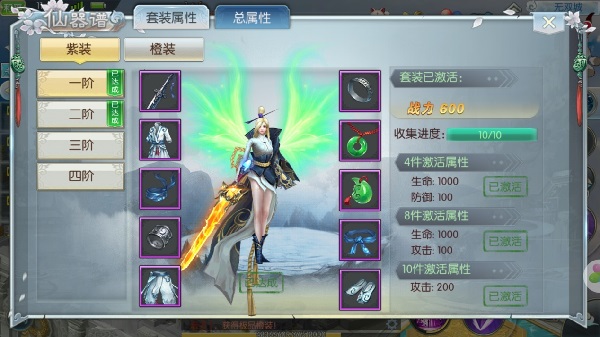 每种品质的同阶的装备获取了四件、八件、十件之后可以激活对应的套装属性,大大增加角色战斗力噢!