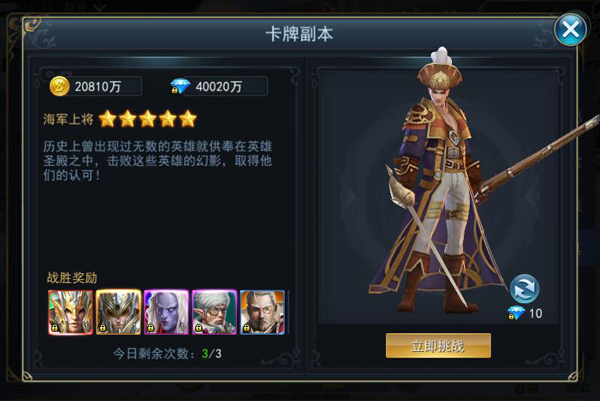 金钱副本目前只开放了一种,通关即可获得大量的金币。每日可以挑战2次,也可以使用免做卡快速完成。