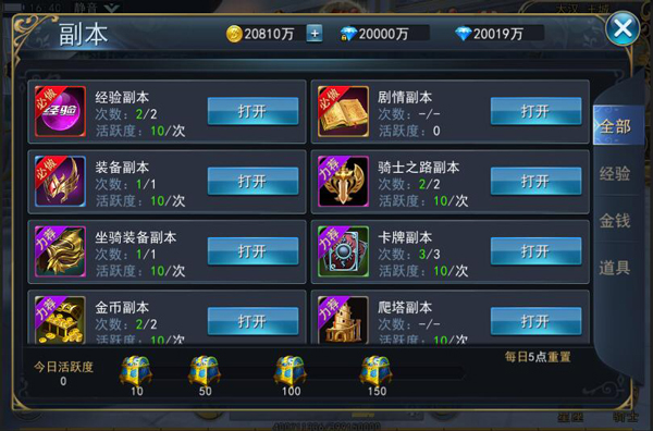 点击界面上方的副本即可快速传送至任意副本,副本根据产出物不同,分为金钱、经验、道具三类。