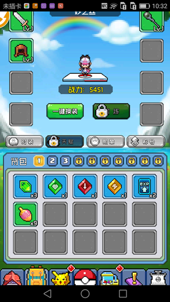 根据佩戴位置不同,可分为武器、帽子、项链、戒指等一共8件装备,对于训练师战斗力有着巨大的帮助。装备可以通过冒险和日常任务获得,前期由于升级快,因此装备的更换频率也很快。