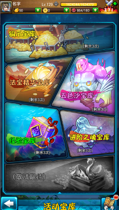 宝库类型:铜币宝库、五色沙宝库、法宝精华宝库、经验宝库