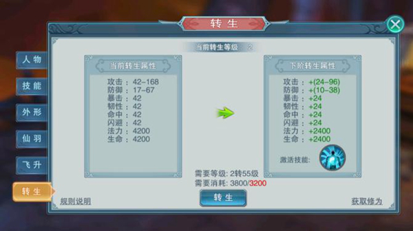 1、转生需要满足等级条件,并且消耗对应的修为。