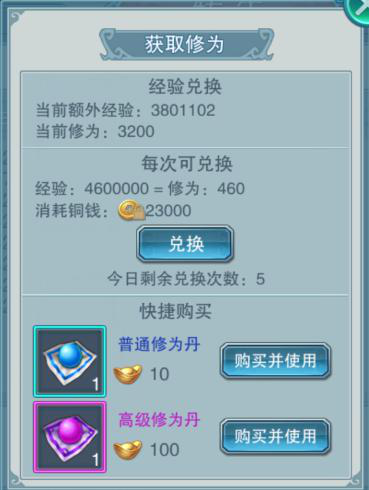 4、转生所需要消耗的修为可通过经验兑换或商城购买修为丹获得。经验兑换修为每天可兑换5次,兑换次数0点重置。