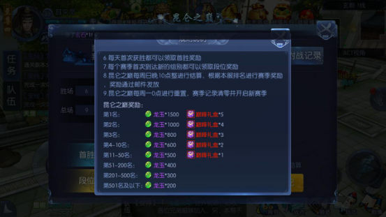 昆仑之巅每周可以排名奖励的龙玉,每日的首胜奖励与段位的奖励也是可以领到龙玉的