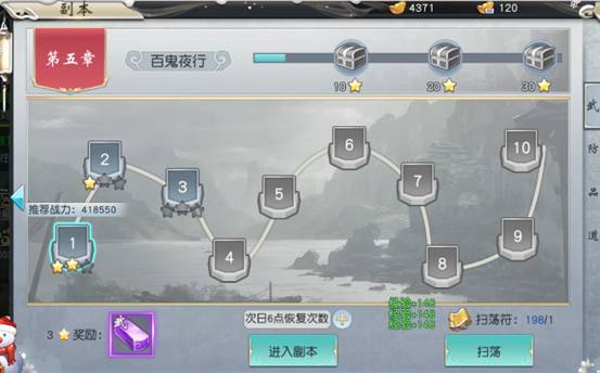经验副本共有8章,达到相应星级可领取宝箱奖励,副本3星开启扫荡功能,使用扫荡符或2元宝(绑定元宝)可以快速扫荡副本