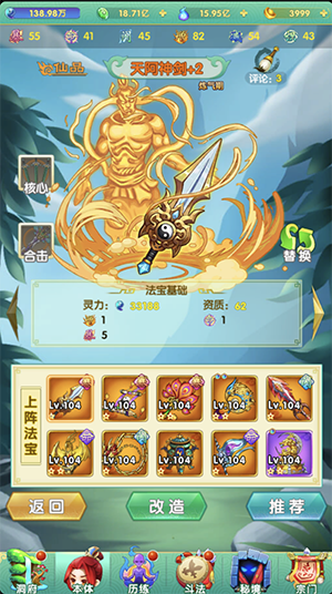 游戏开始时,玩家可进入“炼制法宝”区域进行法宝炼制,获得自己的专属法宝。获得法宝后,可进入“法宝改造”区域对法宝进行改造和升级,以此来增加法宝的战斗力。有法宝助阵,保证你的战斗力,杠杠的!