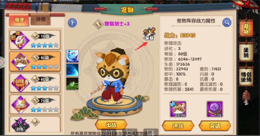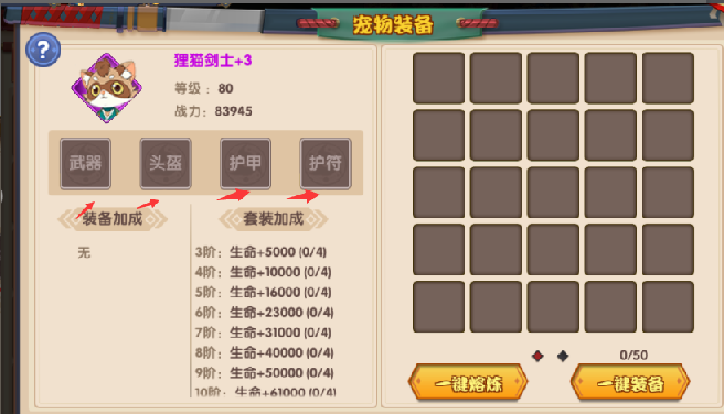 看到红色的标记,那就是我们今天要讲解的宠物装备哦,点击之后会看到四个不同的装备属性空格哦,分别是武器,头盔,护甲,护符,在护甲下面显示的就是进阶之后所加成的生命值与战力哦。