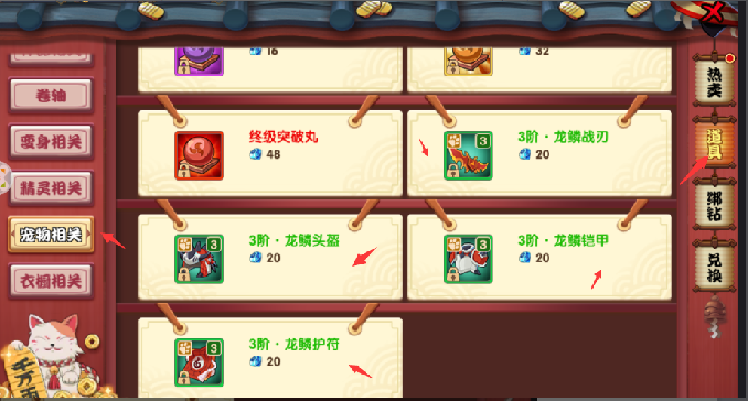 怎么获得到宠物的装备呢?首先各位小伙伴先点击到我们游戏界面的商城,再次点击到道具,拉到最下面的宠物相关,于是就会看见我们新出的宠物装备四个不同属性的哦,购买下来的宠物装备都已经是3阶的呢,需要20钻石购买哦。