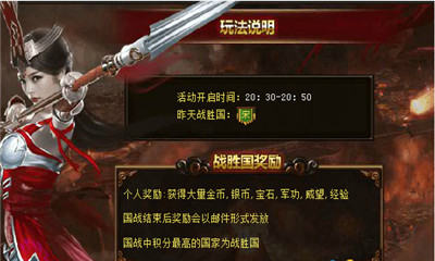 积分最高的那方为战胜国,玩家们只要在游戏内参与战斗即可获得积分,击败玩家可获取更高的积分,国战结束后,我们可以获得大量的金币、银币、宝石还有军功以及威望等奖励。我们可以使用军功到兑换商店里面换到各种游戏内稀有的装备道具,金币和银币也可以拿来招募武将、提升自己的战斗力等等,国战每天都会如期举行,可千万不要错过了噢!