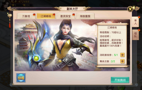 江湖修炼是获得最多经验的一个副本,想要升级快点玩家千万不要错过每天的挑战机会。
