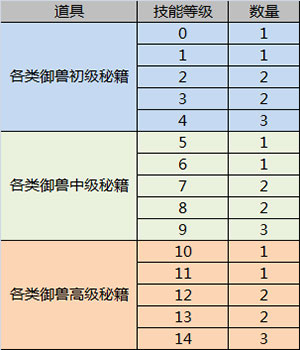 学习宝贝的御兽技能需要消耗一定量的秘籍,御兽技能等级最高为15级。各类御兽技能所消耗的物品和数量如表所示: