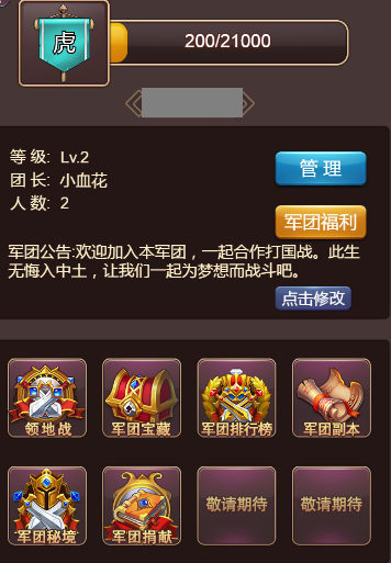 军团福利:每天可以领取1次军团福利,等级越高福利越好。