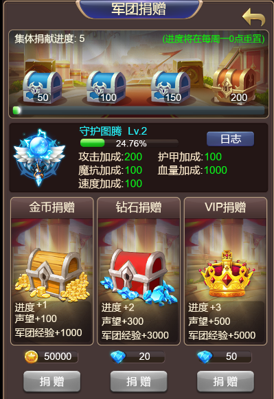 军团捐献:捐献金币或者钻石可增加守护图腾的等级,可增加玩家属性,提高战力。
